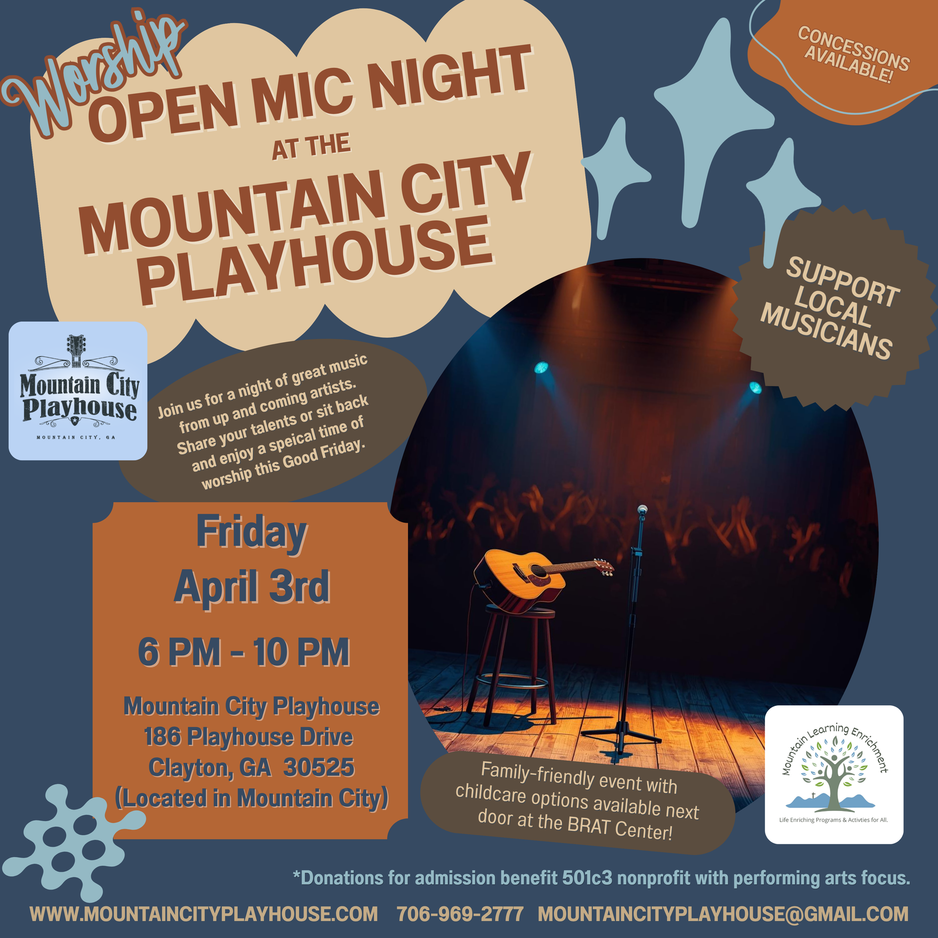 This month’s open mic falls on Good Friday, so we invite you to join us for an evening of worship, community, and creativity at our family-friendly Worship Open Mic Night, hosted at the historic Mountain City Playhouse. This welcoming stage is open to everyone—from first-time participants and local musicians to seasoned singers and worship leaders who feel called to share their gifts. While focusing on Gospel music, all music is welcome.